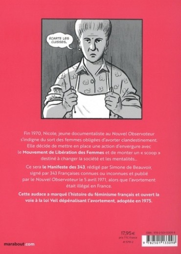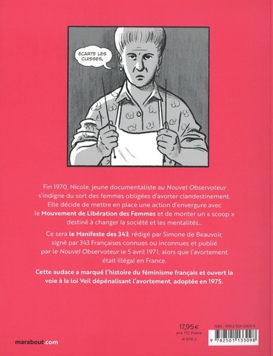 Fin 1970, Nicole, jeune documentaliste au Nouvel Observateur s'indigne du sort des femmes obligées d'avorter clandestinement. Elle décide de mettre en place une action d'envergure avec le Mouvement de Libération des Femmes et de monter un "scoop" destiné à changer la société et les mentalités... Ce sera le Manifeste des 343, rédigé par Simone de Beauvoir, signé par 343 Françaises connues ou inconnues et publié par le Nouvel Observateur le 5 avril 1971, alors que l'avortement était illégal en France. Cette audace a marqué l'histoire du féminisme français et ouvert la voie à la loi Veil dépénalisant l'avortement, adoptée en 1975. Du manifeste des 343, l'Histoire a surtout retenu la couverture satirique de Cabu dans Charlie Hebdo. 50 ans après, les auteurs ont voulu revenir sur les événements qui ont conduit à sa parution dans Le Nouvel Observateur et redonner à chacun·e son rôle légitime.