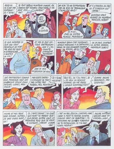 qui chantent. Pour atteindre ses cibles, il se sert de son exceptionnel graphisme qui lui permet de dévoiler les visages sous les masques, et de sa plume terriblement acérée pour reproduire les jargons