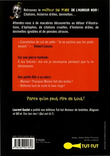 Retrouvez le meilleur du pire de l'humour noir ! Citations, histoires drôles, devinettes... Attendez-vous à de macabres découvertes au détour d'illustrations, d'épitaphes, de citations cruelles, d'histoires drôles, de devinettes ignobles et de pensées atroces.