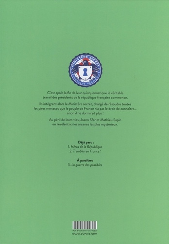 C'est après la fin de leur quinquennat que le véritable travail des présidents de la république française commence. Ils intègrent alors le Ministère secret, chargé de résoudre toutes les pires menaces que le peuple de France n'a pas le droit de connaître... sinon il ne dormirait plus ! Au péril de leurs vies, Joann Sfar et Mathieu Sapin en révèlent ici les arcanes les plus mystérieux.