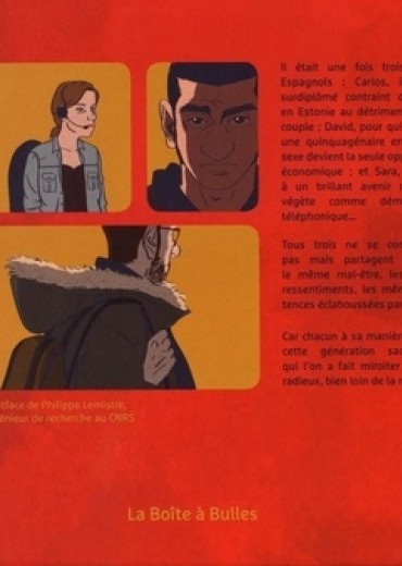 Chronique de l'Espagne contemporaine en trois chapitres, "Le Monde à tes pieds" se penche sur le malaise de trois existences. Sélection officielle festival international de la bande dessinée d'Angoulême 2018. Celle de Carlos ingénieur surdiplômé contraint d'émigrer en Estonie au détriment de son couple de David chômeur depuis 4 ans et dont la seule opportunité financière devient une femme mûre en mal d'amour et de Sara promise à un brillant avenir mais finalement devenue une démarcheuse téléphonique aux ressources insuffisantes... Ils ne se connaissent pas mais partagent le même mal-être, les mêmes ressentiments, les mêmes vies éclaboussées par l'échec. Chacun se bat à sa façon contre une société en pleine crise économique où joindre les deux bouts passe avant la recherche du bonheur personnel. Incarnations d'une génération sacrifiée à qui l'on a fait miroiter un futur radieux, Carlos, David, Sara et tous les autres cherchent leur place et cet avenir fait d'opulence et de joie qu'on leur avait promis. Un triptyque chargé d'intensité et d'émotions qui dessine le portrait lucide d'un mal-être social. En sélection officielle Angoulême 2018.