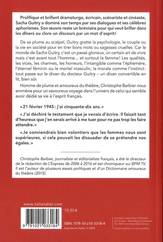 Prolifique et brillant dramaturge, écrivain, scénariste et cinéaste, Sacha Guitry a dominé son temps par ses dialogues et ses célèbres aphorismes. Son oeuvre reste un bréviaire pour qui veut briller dans les dîners ou clore un discours par un mot d'esprit ! De sa plume au scalpel, Guitry gratte la psychologie, le couple ou la vie en société pour en tirer bons mots ou sagesses cruelles. Car le monde de Sacha Guitry, c'est un passé glorieux, un certain art de vivre mais c'est avant tout l'homme... et surtout la femme ! Les qualités, les vices, les charmes, les horreurs, l'intangible comme l'éphémère, l'éternel féminin ou le mortel masculin, la morale comme l'instinct : tout passe sur le divan du docteur Guitry — un divan convertible en lit, bien sûr. Homme de plume et amoureux du théâtre, Christophe Barbier nous emmène pour un savoureux voyage dans l'univers de celui qui semble avoir dédié sa vie à l'esprit français.