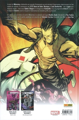La mort de Wolverine a déclenché une cascade d'événements qui ont entraîné d'importantes répercussions sur bon nombre de mutants. A commencer par X-23. Dents de Sabre. Mystique et Lady Deathstrike — liés à Logan pour diverses raisons — mais aussi Siphon, Shogun et la dangereuse Fantomelle. issus du programme Arme X. En outre, les plans de Sinistre visant à récupérer l'adamantium du Canadien griffu se précisent. Ce volume met un terme à la série Wolverines Le scénario est signé Charles Soule (Daredevil) et Ray Fawkes (One Soul) tandis que la partie graphique est assurée par Salvador Larroca (Invincible Iron Alan) et Juan Doe (Deadpool), entre autres.