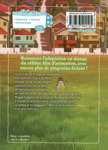 Le récit de cet étrange et inoubliable été s'achève... Tout s'accélère lorsque Suzuki trouve un petit jabberwocket que le père de Hamamoto et son équipe de chercheurs ont vent de cette découverte singulière. Malgré l'urgence de ta situation, Aoyama peine encore à trouver le lien exact entre l'assistante dentaire, la sphère et les pingouins... Mais la clé du mystère n'est plus bien loin !