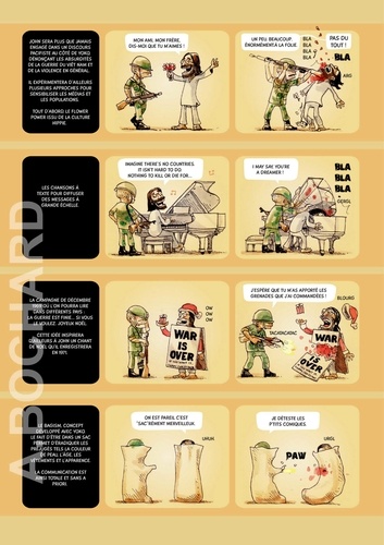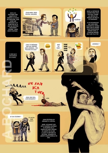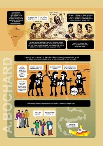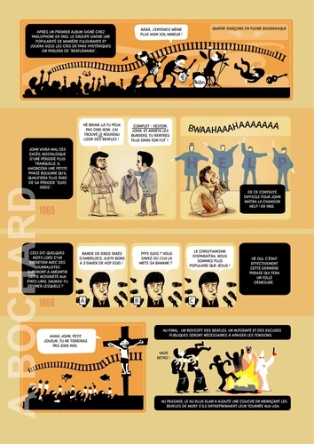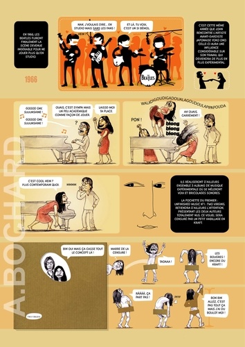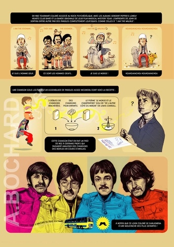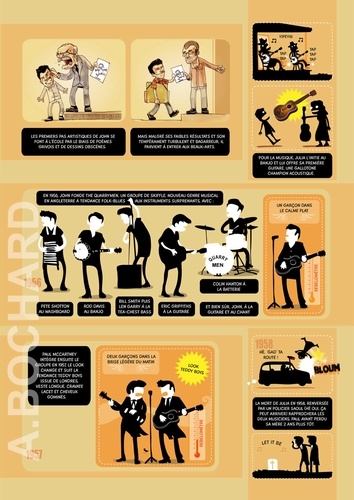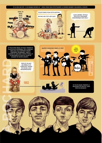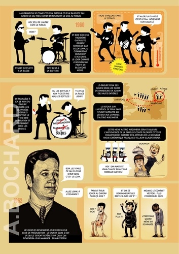 Cet album de 54 pages présente 5 biographies synthétiques des stars du rock qui ont marqué les années 60/70… en s’apparentant aux documentaires TV qui alternent interviews, images d'archives, vidéos et photos, voix off...pour permettre à tous les publics de découvrir le Panthéon du rock ! Le ton est humoristique, volontairement décalé…parfois tendre mais souvent corrosif. On croirait entendre Antoine de Caunes présentant les enfants du rock ! L’auteur dessinateur, Alexandre Bochard, a utilisé différentes approches graphiques (dessin à la main aquarellé, illustrations réalistes au stylo bille, tracé vectoriel, pochade numérique à la tablette graphique...) afin d'enrichir visuellement le rendu et d’adapter le graphisme à l'information à communiquer.