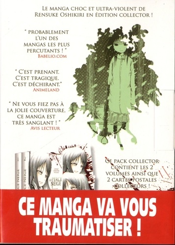 Coffret intégral du manga Le Perce-neige. Quand le harcèlement dégénère en Battle Royale ! Le lecteur suit le quotidien difficile de Haruka Nozaki, une adolescente qui emménage avec sa famille dans une ville rurale du Japon. Elle intègre ainsi l'école de la petite ville et doit faire face aux harcèlements de ses camarades de classe particulièrement cruels. Ne voulant pas inquiéter sa soeur et le reste de sa famille, Haruka décide de prendre sur elle du mieux qu'elle peut. Mais tout bascule lorsque ses bourreaux provoquent par accident l'incendie de sa maison, entraînant la mort de ses parents et le coma de sa petite soeur, gravement brûlée. Haruka décide alors de se venger... POINTS FORTS - L'intégralité de la série réunie dans un coffret collector. - Seinen au format double de 320 pages, soit 650 pages en 2 volumes. - En bonus : 2 cartes collector - Par Rensuke OSHIKIRI, l'auteur de Bip-Bip Boy (Omaké Manga) et de High Score Girl (Netflix). - Une histoire violente et sociale sur un cas de harcèlement scolaire extrème qui vire en " Battle Royale ". - Le manga a déjà été adapté au cinéma au Japon avec le film Misumiso, sorti en avril 2018. - Une oeuvre choc et marquante, d'une grande qualité narrative. - Thématiques rudes (harcèlement scolaire, vengeance sanglante...), planches très stylisées et plutôt violentes.