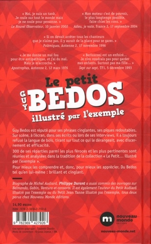 Guy Bedos est réputé pour ses phrases cinglantes, ses piques redoutables. Sur scène, à l'écran, dans ses écrits ou lors de ses interviews, il a toujours refusé la langue de bois, tirant sur tout ce qui le dérangeait, avec discernement et efficacité. 300 de ses réparties parmi les plus féroces et les plus pertinentes sont réunies et analysées dans la tradition de la collection "Le Petit... illustré par l'exemple". Pour mieux les comprendre et, donc, pour mieux les apprécier. Du Bedos tel qu'en lui-même : brillant et cinglant.