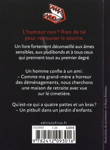 L'humour noir ? Rien de tel pour retrouver le sourire. Un livre fortement déconseillé aux âmes sensibles, aux pudibonds et à tous ceux qui prennent tout au premier degré. Un homme confie à un ami : - Comme ma grand-mère a horreur des déménagements, nous cherchons une maison de retraite avec vue sur le cimetière. Qu'est-ce qui a quatre pattes et un bras ? - Un pitbull dans un jardin d'enfants.