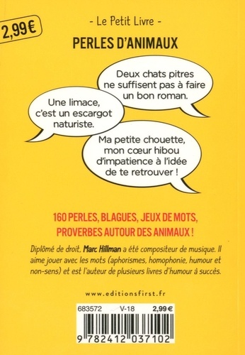Un petit livre d'humour consacré à nos amis les bêtes ! Parce que le rire n'est finalement pas que le propre de l'homme ! Découvrez 160 perles, blagues, jeux de mots, devinettes, proverbes autour des animaux ! Ca ne va pas, ma poule ? -Non, je dois couver quelque chose. Deux chats pitres ne suffisent pas à faire un bon roman. . Ma petite chouette, mon coeur hibou d'impatience à l'idée de te retrouver ! . Une limace, c'est un escargot naturiste. .