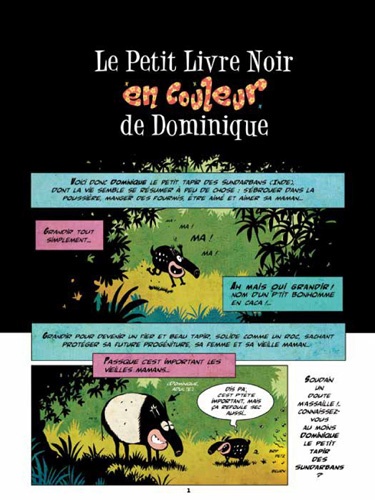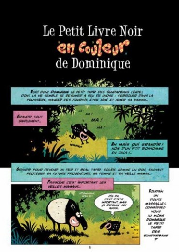 La vie de Dominique, tapir des Sundarbans, aurait pu se résumer à peu de choses, si sa mère n'avait pas eu l'idée de mettre bas sur les ruines d'un vieux cimetière indien... Dominique est apparu le temps de 3 cases dans l'album Le Fantôme en Tergal, et va vivre ici une vie truffée d'obstacles, de malchances et de catastrophes. Le Petit Livre noir en couleur de Dominique est un livre d'aventures, drôle et cruel, au graphisme fort. Il inaugure la nouvelle collection Alimentation Générale, collection dirigée par Terreur Graphique et dédiée à l'humour, dans l'esprit développé au sein de la revue du même nom.