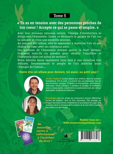 " Tu es en tension avec des personnes proches de ton coeur ! Accepte ce qui se passe et respire. " Avec leur nouveau vaisseau solaire, l'équipe d'aventuriers se dirige vers l'Amazonie. Janou va découvrir le peuple de l'air sur la canopée et vivre une nouvelle mission. Au sommet des arbres, elle va apprendre à maîtriser l'air et son chakra du coeur avec ses nouveaux amis. Ces gardiens de l'Amazonie doivent guérir la forêt abîmée. Comment vont-ils s'y prendre pour rétablir l'équilibre et l'harmonie dans cet océan de verdure ? Notre héroïne devra également faire face à une situation très délicate, heureusement le peuple de l'air maîtrise aussi l'énergie de l'amour... Ouvre vite cet album pour devenir, toi aussi, un petit yogi ! Cartes à collectionner à l'intérieur du livre. (Cartes chakra, sens, son, élément, expériences).