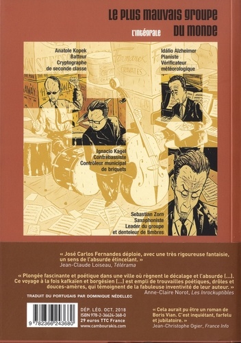 Anatole Kopek : Batteur, Cryptographe de seconde classe. Idalio Alzheimer : Pianiste, Vérificateur météorologique. Ignacio Kagel : Contrebassiste, Contrôleur municipal de briquets. Sebastian Zorn : Saxophoniste, Leader du groupe et denteleur de timbres.