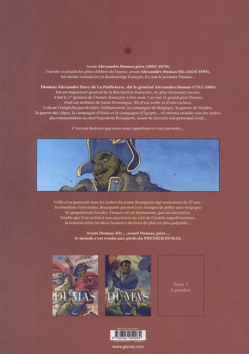 Dumas face à Bonaparte : deux hommes, deux forces, deux visions opposées. Qui aurait pu imaginer que le père d'Alexandre Dumas fut un ancien esclave noir devenu un grand général de l'armée puis le principal rival de Napoléon ? C'est pourtant le parcours hors du commun de cet homme né en Haïti d'un père noble blanc. En s'enrôlant dans l'armée, Alexandre renonce à son nom de famille et commence au plus bas de l'échelle. A force de prouesses militaires, il sera nommé chef de l'armée occidentale en 1794. Il consolide alors les victoires révolutionnaires contre les insurgés. Commeà son habitude, il se démarque des soldats en évitant les excès et surtout, en épargnant les civils. Dumas réorganise l'armée et condamne fermement les exactions ! Sa carrière va prendre une tournure inattendue lorsqu'il est repéré par Napoléon Bonaparte et intègre l'armée italienne à Milan ! Mais en entrant sous les ordres du jeune Bonaparte âgé seulement de 27 ans, la situation va s'envenimer. Bonaparte permet à ses troupes de piller sans vergogne les populations locales. Dumas est un humaniste, pas un meurtrier. Tandis que l'on assiste à son ascension au sein de l'armée napoléonienne, la tension entre les deux hommes devient de plus en plus palpable... Dans ce second tome Salva Rubio qui a travaillé sur de nombreux ouvrages historiques (Django Main de feu ou Les Zazous) et le dessinateur Ruben Del Rincon (Les Trois Mousquetaires) continuent de nous surprendre avec ce récit incroyable en hommage à ce héros de guerre et fervent républicain, oublié par l'Histoire qui finira par diriger 50 000 hommes et prendre part à la Révolution française.