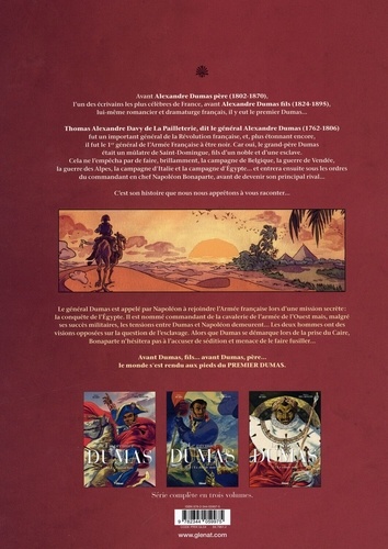 Dumas face à Bonaparte : deux hommes, deux forces, deux visions opposées. Qui aurait pu imaginer que le père d'Alexandre Dumas fut un ancien esclave noir devenu un grand général de l'armée puis le principal rival de Napoléon ? C'est pourtant le parcours hors du commun de cet homme né en Haïti d'un père noble blanc. En s'enrôlant dans l'armée, Alexandre renonce à son nom de famille et commence au plus bas de l'échelle. A force de prouesses militaires, il sera nommé chef de l'armée occidentale en 1794. Sa carrière va prendre une tournure inattendue lorsqu'il est repéré par Napoléon Bonaparte. Bientôt, le général Dumas est appelé par Napoléon à rejoindre l'armée française lors d'une mission secrète : la conquête de l'Egypte. Il y est nommé commandant de la cavalerie de l'armée de l'Ouest et va combattre aux côtés de héros tels que Kléber et Murat. Mais malgré ses succès militaires, les tensions entre Dumas et Napoléon demeurent... Les deux hommes ont des visions opposées sur la question de l'esclavage. Alors que Dumas se démarque lors de la prise du Caire, Bonaparte n'hésitera pas à l'accuser de sédition et menace de le fusiller ! Dumas décide de quitter l'armée mais le destin le retiendra en Afrique. Après une vie sur le champ de bataille, Dumas parviendra-t-il à retrouver ceux qu'il aime le plus et qui l'attendent. Rien n'est certain, capturé à Naples, il se retrouve emprisonné... Dans ce troisième et dernier tome, Salva Rubio qui a travaillé sur de nombreux ouvrages historiques (Django Main de feu ou Les Zazous) et le dessinateur Ruben Del Rincon (Les Trois Mousquetaires) continuent de nous surprendre avec ce récit incroyable en hommage à ce héros de guerre et fervent républicain, oublié par l'Histoire qui finira par diriger 50 000 hommes et prendre part à la Révolution française.