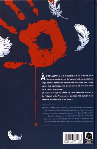 Après L'étrange Vie de Nobody Owens, retrouvez tout le talent de conteur de Philip Craig Russell dans un récit envoûtant, adapté d'une pièce radiophonique de Neil Gaiman. à son allure, on n'aurait jamais deviné que l'homme assis là , sur le banc, était en réalité un ange déchu, descendu depuis des éternités des cieux parmi les hommes, afin de conter une histoire que vous devez entendre... Une histoire qui raconte les Mystères du meurtre. Les Mystères du TOUT premier meurtre de l'histoire de l'Humanité. Un meurtre survenu au paradis. Le meurtre d'un ange...