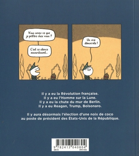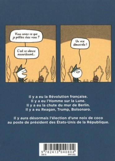 Electeur lambda, jeune couple, institut de sondage, polémiste, chauffeur Uber, amateur de crossfit... toute la société réagit à l'élection improbable d'une noix de coco au poste de président. On retrouve dans cette BD chorale l'écriture pertinente et impertinente de Marc Dubuisson qui aborde avec humour et justesse les sujets sociétaux et les tendances culturelles.