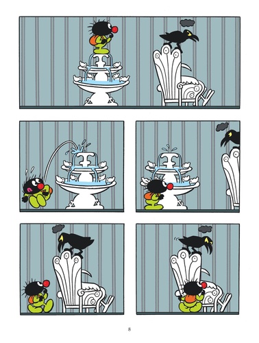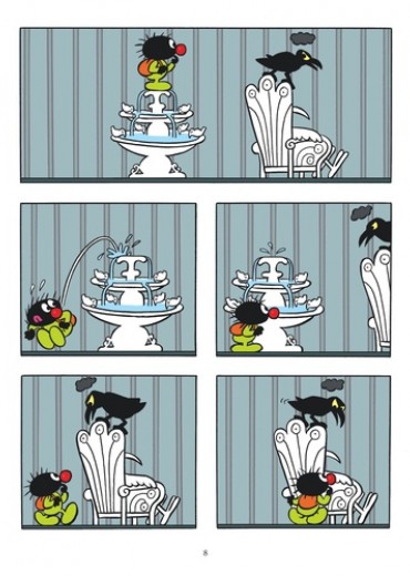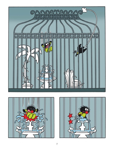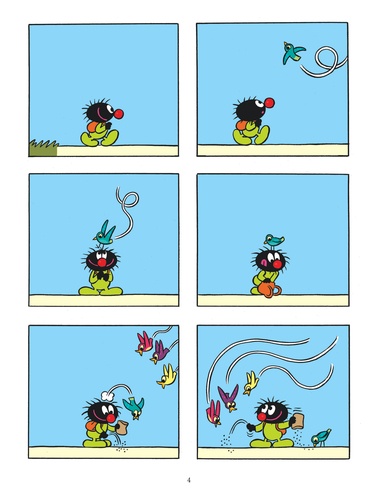 Dans le monde des oiseaux où Petit Poilu s'est cette fois retrouvé parachuté règne un prince bien malheureux. Prisonnier d'une grande cage dorée, le prince comme le décor qui l'entoure sont en noir et blanc. La faute à Topor, un sinistre corbeau qui le suit à la trace. Petit Poilu essaie tant bien que mal d'insuffler un peu de joie au prince avec des jouets colorés, mais le satané corbeau les détruit à chaque fois... Inébranlable, notre petit héros préféré sort alors de son sac à dos peintures et palette et entreprend de repeindre le triste prince et son monde. Avec succès : les couleurs s'étalent, la vie reprend ! Et, cette fois, le prince ne se laissera pas faire. En quelques habiles coups de pinceau, il transforme le vilain Topor en oiseau rose à pois verts et s'affranchit même de sa cage ! Avec cette nouvelle fable juste, sensible et ludique, Petit Poilu apprend aux petits lecteurs comment réagir aux influences néfastes.