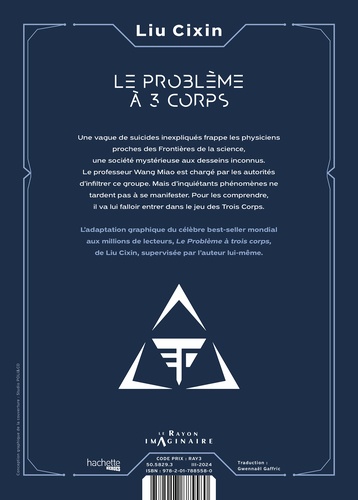Une vague de suicides inexpliqués frappe les physiciens proches des Frontières de la science, une société mystérieuse aux desseins inconnus. Le professeur Wang Miao est chargé par les autorités d'infiltrer ce groupe. Mais d'inquiétants phénomènes ne tardent pas à se manifester. Pour les comprendre, il va lui falloir entrer dans le jeu des Trois Corps... L'adaptation graphique du célèbre best-seller mondial aux millions de lecteurs, Le Problème à trois corps, de Liu Cixin, supervisée par l'auteur lui-même.