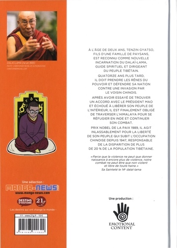 A l'âge de deux ans, Tenzin Gyatso, fils d'une famille de paysans, est reconnu comme nouvelle incarnation du Dalaï-Lama, guide spirituel et dirigeant du peuple tibétain. Quatorze ans plus tard, il doit prendre les rênes du pouvoir et défendre sa nation contre une invasion par le voisin chinois. Après avoir essayé de trouver un accord avec le président Mao et échoué à libérer son peuple de l'intérieur, il est finalement obligé de traverser l'Himalaya pour se réfugier en inde et continuer son combat. Prix Nobel de la paix 1989, il agit inlassablement pour la liberté de son peuple qui subit l'occupation chinoise depuis 1947, responsable de la disparition de plus de 20 % de la population tibétaine.