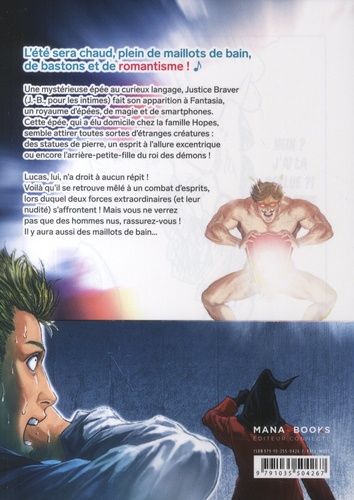 Découvrez l'épée la plus puissante de Fantasia ! Une mystérieuse épée au curieux langage, Justice Braver (J. -B. , pour les intimes) fait son apparition à Fantasia, un royaume d'épées, de magie et de smartphones. Cette épée, qui a élu domicile chez la famille Hopes, semble attirer toutes sortes d'étranges créatures : des statues de pierre, un esprit à l'allure excentrique ou encore l'arrière-petite-fille du roi des démons ! Lucas, lui, n'a droit à aucun répit ! Voilà qu'il se retrouve mêlé à un combat d'esprits, lors duquel deux forces extraordinaires (et leur nudité) s'affrontent ! Mais vous ne verrez pas que des hommes nus, rassurez-vous ! Il y aura aussi des maillots de bain...