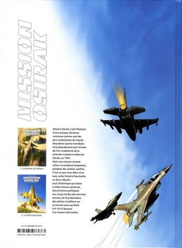 Mission Osirak, c'est l'histoire d'une attaque aérienne reconnue comme une des plus audacieuses de l'après Deuxième Guerre mondiale le bombardement par l'armée de l'air israélienne de la centrale nucléaire irakienne Osirak, en 1981. Mais une mission comme celle-ci se prépare longtemps, pendant des années, parfois. C'est ce que vous allez vivre avec cette histoire fascinante en deux albums tout l'historique qui mène à cette mission aérienne, des prémices politiques aux coups tordus des services secrets, de la préparation des pilotes israéliens sur ce nouvel avion qu'était le F-16 à l'époque à la mission elle-même.