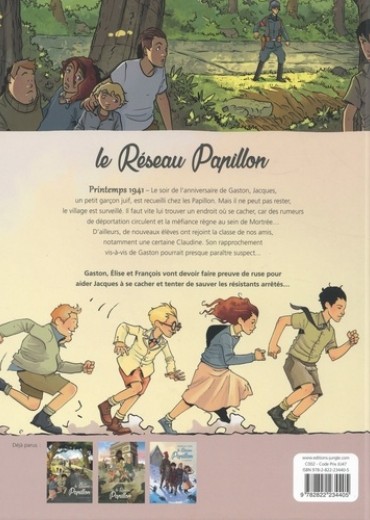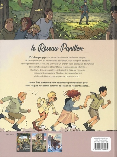 Printemps 1941— Le soir de l'anniversaire de Gaston, Jacques, un petit garçon juif, est recueilli chez les Papillon. Mais il ne peut pas rester, le village est surveillé. Il faut vite lui trouver un endroit où se cacher, car des rumeurs de déportation circulent et la méfiance règne au sein de Mortrée... D'ailleurs, de nouveaux élèves ont rejoint la classe de nos amis, notamment une certaine Claudine. Son rapprochement vis-à-vis de Gaston pourrait presque paraître suspect... Gaston, Elise et François vont devoir faire preuve de ruse pour aider Jacques à se cacher et tenter de sauver les résistants arrêtés...