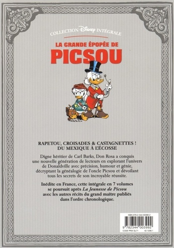 Toute l'oeuvre culte de Don Rosa dans une superbe intégrale ! Voici déjà le dernier tome de la réédition des aventures cultes de l'oncle Picsou par Don Rosa ! Avec ce septième volume de La Grande épopée de Picsou, l'oeuvre dense et cohérente d'un auteur culte du catalogue Disney trouve enfin la complète édition qu'elle mérite. Revue et corrigée par Don Rosa lui-même - qui la considère d'ailleurs comme la meilleure jamais réalisée -, cette superbe intégrale des aventures de Picsou est le cadeau rêvé pour les aficionados qui veulent retrouver leur personnage favori sous ses plus beaux atours, tout autant que pour les novices qui souhaitent découvrir des histoires à la fois drôles, profondes et riches en aventure. Longtemps réclamée à cor et à cri par les canardophiles, cette intégrale inédite a été accueillie unanimement puisqu'elle s'est déjà vendue à plus de 150 000 exemplaires !