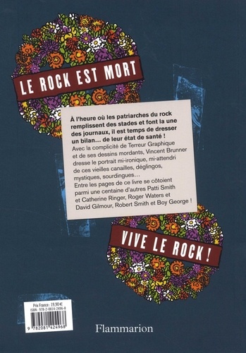 A l'heure où les patriarches du rock remplissent des stades et font la une des journaux, il est temps de dresser un bilan de leur état de santé ! Avec la complicité de Terreur Graphique et de ses dessins mordants, Vincent Brunner dresse le portrait mi-ironique, mi-attendri de ces vieilles canailles, déglingos, mystiques, sourdingues... Entre les pages de ce livre se côtoient parmi une centaine d'autres Patti Smith et Catherine Ringer, Roger Waters et David Gilmour, Robert Smith et Boy George !