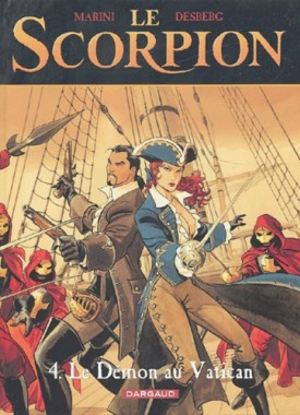 Depuis trois jours et trois nuits, Rome pleure son pape. Un prêtre défroqué a poignardé cet homme bon lors d'une des sorties qu'il effectuait incognito pour se mêler au petit peuple qu'il aimait tant. L'homme a été réglé d'avance. Son prix : le corps de quelques catins. Trois jours, trois nuits pendant lesquelles le Cardinal Trebaldi tisse la toile qui doit lui permettre de s'asseoir sur le trône de Pierre. Deux de ses pairs qui le contestent sont assassinés. Dont un par le cardinal lui-même. Les Neuf Familles qui, dans l'ombre, dirigent le monde depuis des siècles, se rallient à lui. Car, Trebaldi au Vatican, c'est l'assurance que les idées folles de liberté et d'égalité qui commencent timidement à gangrener les sociétés du XVIIe siècle, seront impitoyablement extirpées de l'esprit et du coeur des hommes. Trebaldi agenouillé devant un crucifix, s'en amuse : "N'est-il pas ironique, Ô Dieu, qu'un homme qui ne croit pas en toi soit appelé pour remettre de l'ordre parmi tes fidèles ? " Quant aux terribles moines soldats, ils traquent dans la ville le seul homme qui puisse encore empêcher le règne de leur maître. Un homme qui porte un scorpion tatoué sur l'épaule droite. Le Scorpion est le fils d'une femme dont le crime fut d'aimer un homme de Dieu. Trebaldi la fit brûler vive comme sorcière. Le Scorpion vient tout juste de découvrir qui était son père : le pape assassiné. Aussi, lorsque, à l'issue du deuil, la foule se masse place Saint-Pierre pour écouter pérorer Trebaldi, un homme se dresse sur les toits. A sa main une arbalète, une poche de sang accrochée au carreau. De sa bouche, le peuple entend la vérité sur la mort de son souverain pontife bien-aimé. Les moines soldats s'élancent. Mais on n'arrête pas le Scorpion si facilement... Formidable roman de cape et d'épée mâtiné de fantastique, Le Scorpion allie une élégance du dessin fabuleuse à un sens du mouvement rare. Marini, également coloriste de la série, transforme certaines cases en véritables tableaux d'époque.