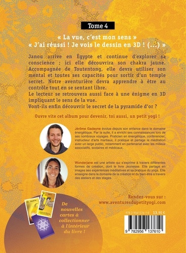 " La vue, c'est mon sens. " " J'ai réussi ! Je vois le dessin en 3D ! (...) " Janou arrive en Egypte et continue d'explorer sa conscience ; ici elle découvrira son chakra jaune. Accompagnée de Toutentong, elle devra utiliser son mental et toutes ses capacités pour sortir d'un temple secret. Notre aventurière devra apprendre à être au contrôle tout en se sentant libre. Le lecteur se retrouvera aussi face à une énigme en 3D impliquant le sens de la vue. Vont-ils enfin découvrir le secret de la pyramide d'or ? Ouvre vite cet album pour devenir, toi aussi, un petit yogi ! " Cartes à collectionner à l'intérieur du livre. (Cartes chakra, sens, son, élément, expériences). "