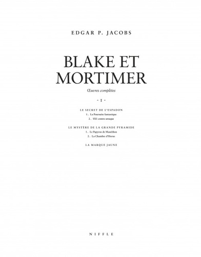 Retour aux sources du travail de Jacobs avec la première intégrale de ses oeuvres comprenant les tomes 1 à 6 de la série. Editée dans la collection Niffle (Thorgal, Comanche) sous le label des Editions Blake & Mortimer, cette intégrale en noir et blanc met pleinement en valeur le trait de Jacobs et la qualité de son travail graphique : les planches ont été rescannées et nettoyées et, pour parfaire le rendu visuel, l'album est édité en grand format sur un papier de qualité. Une couverture en noir et blanc de Blake et Mortimer, parue dans le Journal Tintin, ravira les amateurs qui pourront la mettre sous cadre. Vendu à un prix démocratique, ce beau livre est un magnifique complément à la série et permet de redécouvrir l'oeuvre de Jacobs avec un regard neuf.