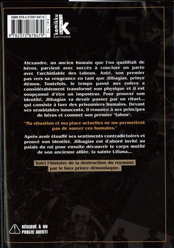 Alexandre. un ancien humain que l'on qualifiait de héros. parvient avec succès à conclure un pacte avec l'archidiable des tabous, Anté. son premier pas vers sa vengeance en tant que Jilbagias, prince démon. Toutefois, le temps passé aux enfers a considérablement transformé son physique et il est soupçonné d'être un imposteur. Pour prouver son identité. Jilbagias va devoir passer par un rituel... qui consiste à tuer des prisonniers humains. Devant ses semblables innocents, il renonce à ses principes de héros et commet son premier "tabou". "Ma situation et ma place actuelles ne me permettent pas de sauver ces humains." Après avoir étouffé ses sentiments contradictoires et prouvé son identité, Jilbagias est d'abord invité au palais du roi pour ensuite découvrir le corps mutilé de son ancienne alliée, la sainte Liliana... Voici l'histoire de la destruction du royaume par le faux prince démoniaque.