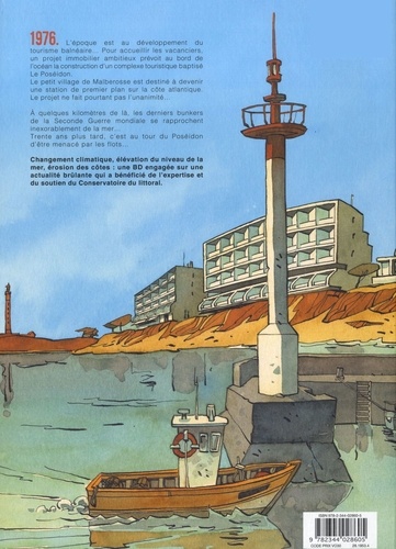 La nature ne s'achète pas 1976. Un projet immobilier ambitieux prévoit au bord de l'océan la construction d'un complexe touristique baptisé le Poséidon. Le petit village de Malberosse est destiné à devenir une station balnéaire de premier plan sur la côte atlantique. A quelques kilomètres de là, les derniers bunkers de la Seconde Guerre mondiale, léchés par l'océan, s'enfoncent inexorablement dans le sable... Trente ans plus tard, c'est au tour du Poséidon d'être menacé par les flots... Les auteurs proposent une histoire humaine qui nous interroge sur les changements climatiques d'aujourd'hui et nous sensibilise sur la montée des eaux face à l'urbanisation. Réchauffement climatique, élévation du niveau de la mer, érosion des côtes : une BD engagée sur une actualité brûlante... Un ouvrage publié en partenariat avec le Conservatoire du littoral.