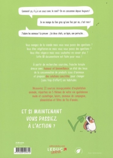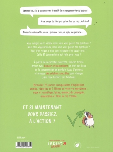 Comment ça, il y a un souci avec le miel ? On en consomme depuis toujours ! Je ne mange du foie gras qu'une fois par an, c'est rien ! J'adore les animaux ! La preuve : j'ai deux chats, un lapin, une perruche... Vous mangez de la viande mais vous vous posez des questions ? Vous êtes végétarien. ne mais vous vous posez des questions ? Vous êtes végan. e mais vous souhaitez en savoir plus ? Cette BD documentaire est faite pour vous ! A partir de recherches sourcées, Franche hirsute dresse avec humour et bienveillance un état des lieux de la consommation de produits issus d'animaux et propose des solutions concrètes pour changer (sans trop d'effort) ses habitudes. Découvrez 22 sources insoupçonnées d'exploitation animale, réparties en 5 thèmes de votre vie quotidienne : mode et cosmétique, loisirs, animaux de compagnie, alimentation et fêtes de fin d'année. ET SI MAINTENANT VOUS PASSIEZ A L'ACTION ? A 23 ans, après une prépa HEC et 2 années en école de commerce, Franche hirsute a pris un virage à 180 degrés vers le milieu artistique. Elle lance sa page Instagram @franche_hirsute pour y représenter ses premiers pas dans le véganisme, qui a bouleversé sa vision du monde et son rapport aux animaux non humains. Aujourd'hui autrice et illustratrice, aider les gens à ouvrir les yeux sur l'exploitation animale en leur apportant de l'information est devenu une part essentielle de son travail. Retrouvez-la sur son compte Instagram @franche_hirsute