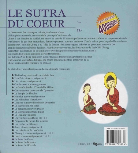 La découverte des classiques chinois, fondement d'une philosophie ancestrale, est essentielle pour qui s'intéresse à la Chine, à son histoire, sa société, ses arts et sa pensée. Si beaucoup d'entre eux ont été traduits en langue occidentale, leur lecture, de par leur profondeur, demeure pourtant souvent malaisée. C'est la raison pour laquelle l'humoriste et dessinateur Tsai Chih Chung a eu l'idée de donner vie à cette sagesse chinoise en proposant une série des grands classiques en bande-dessinée. Mondialement connues, les illustrations de Tsai Chih Chung permettent aux lecteurs de se familiariser avec les grandes doctrines chinoises, dans la simplicité d'un temps qui passe alors différemment. Les Editions You-Feng proposent aujourd'hui ces traductions agrémentées de leur texte chinois, une lecture bilingue qui ravira non seulement les amoureux de la Chine mais aussi les étudiants en chinois !