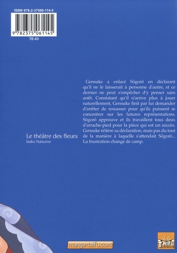 Gensuke a enlacé Sôgorô en déclarant qu'il ne le laisserait à personne d'autre, et ce dernier ne peut s'empêcher d'y penser sans arrêt. Constatant qu'il n'arrive plus à jouer naturellement, Gensuke finit par lui demander d'arrêter de ressasser pour qu'ils puissent se concentrer sur les futures représentations. Sôgorô approuve et ils travaillent tous deux d'arrache-pied pour la pièce qui est un succès. Gensuke réitère sa déclaration, mais pas du tout de la manière à laquelle s'attendait Sôgorô... Isaku Natsume La frustration change de camp.