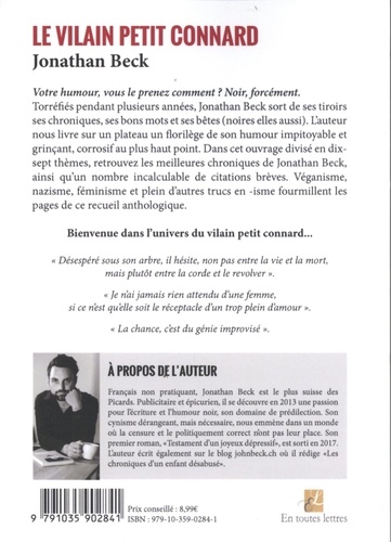 Votre humour, vous le prenez comment ? Noir, forcément. Torréfiés pendant plusieurs années, Jonathan Beck sort de ses tiroirs ses chroniques, ses bons mots et ses bêtes (noires elles aussi). L'auteur nous livre sur un plateau un florilège de son humour impitoyable et grinçant, corrosif au plus haut point. Dans cet ouvrage divisé en 17 thèmes, retrouvez les meilleures chroniques de Jonathan Beck, ainsi qu'un nombre incalculable de citations brèves. Véganisme, nazisme, féminisme et plein d'autres trucs en -isme fourmillent les pages de ce recueil anthologique. Bienvenue dans l'univers du vilain petit connard...