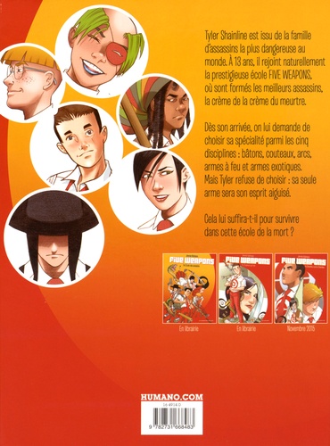 Tyler Shainline est issu de la famille d'assassins la plus dangereuse au monde. À 13 ans, il rejoint naturellement la prestigieuse école Five Weapons, où sont formés les meilleurs assassins, la crème de la crème du meurtre. À son arrivée, on lui demande de choisir sa spécialité parmi les cinq disciplines : bâtons, lames, arc, armes à feu et armes exotiques. Mais Tyler refuse de choisir parmi ces options : sa seule arme sera son esprit aiguisé. Cela lui suffira-t-il pour survivre dans cette école de la mort ?