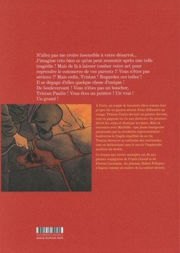A Paris, un couple de bouchers élève comme leur propre fils un garçon atteint d'une difformité au visage. Tristan Paulin devient un peintre fervent, tout en gagnant sa vie aux abattoirs. Sa peinture décrit les corps et dissèque les âmes. Mais la rencontre avec Mathilde — une jeune bourgeoise passionnée par la révolution impressionniste — bouleverse le fragile équilibre de sa vie. Tristan découvre la confusion des sentiments, tout en déclenchant sans le savoir l'implacable machine du destin. Ce drame aux tiroirs multiples est dû aux plumes conjuguées de Frank Giroud et de Florent Germaine. Au pinceau, Ruben Pellejero s'impose comme un maître de la couleur directe.