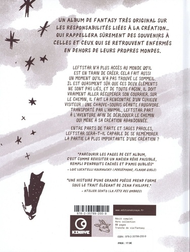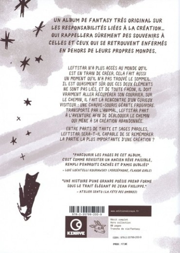 Un album de fantasy très original sur les responsabilités liées à la création... Qui rappellera surement des souvenirs à celles et ceux qui se retrouvent enfermés en dehors de leurs propres mondes. Leftstar n'a plus accès au monde qu'il est en train de créer. Cela fait aussi un moment qu'il n'a pas trouve le sommeil. Il est quasiment sûr que ces deux éléments ne sont pas liés, et de toute façon, il doit vraiment aller récupérer son courrier. Sur le chemin, il fait la rencontre d'un curieux visiteur : une chauve-souris géante frugivore. Transporté par l'animal, Leftstar part à l'aventure afin de débloquer le chemin qui mène à sa création abandonnée. Entre parts de tarte et sages paroles, Leftstar sera-t-il capable de se remémorer la partie la plus importante d'une création ?
