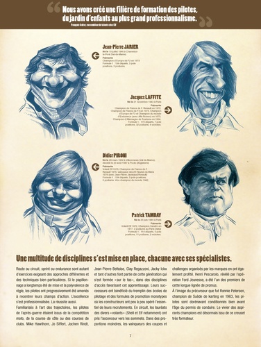 Le pilotage est un art. Quelques virtuoses ont su en maîtriser toutes les subtilités. D'Ascari à Vettel, leurs exploits ont fait vibrer les foules. Parmi les rois de la vitesse, Fangio, Clark, Moss, Stewart, Villeneuve, Lauda, Prost, Senna ou Schumacher ont exercé un formidable pouvoir de fascination. Sur les circuits, leurs successeurs perpétuent la légende. Sur route, Loeb s'est accaparé tous les records. Un Seb' peut en cacher un autre : Ogier se propose de prendre le relais. Cet album prend l'aspiration des bolides et de leurs dompteurs les plus emblématiques par les raccourcis de l'anecdote, sans dévier de la trajectoire de l'humour. Un tour de piste en fanfare et en accéléré où défile plus d'un siècle d'une aventure fascinante. Contact... moteur !