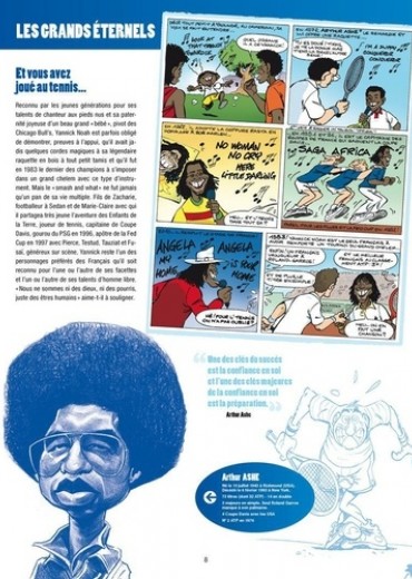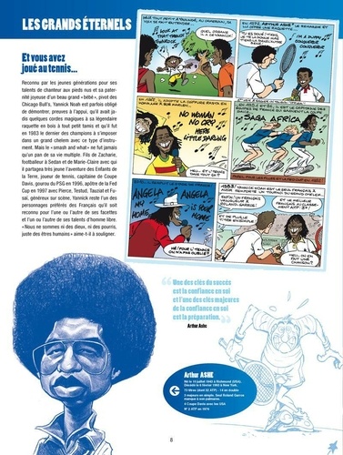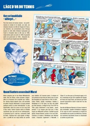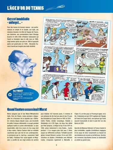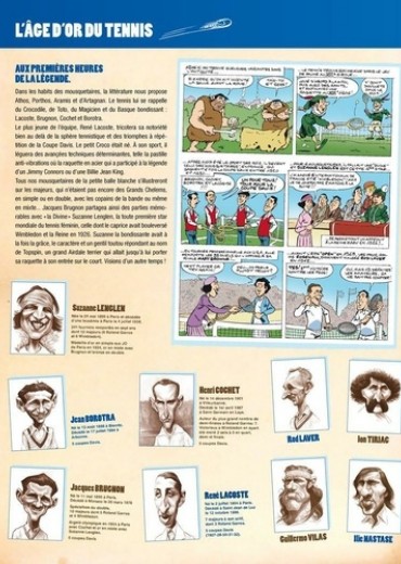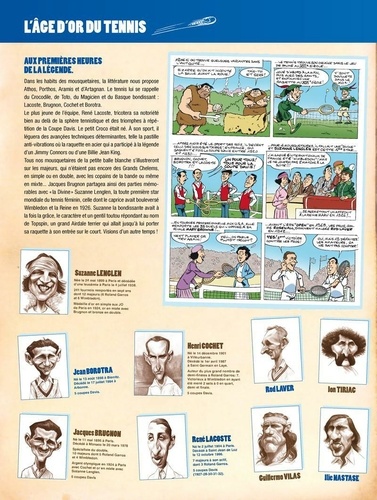 Les Légendes, les vraies, ne sont pas seulement des lignes de palmarès plus ou moins longues. La rigueur mathématique ne survit jamais à la vérité du temps qui passe. Il nous faut des légendes extraordinaires qui s'étirent durablement dans nos mémoires. Elles peuvent alors s'installer, tranquillement, au panthéon du Hall of Fame de la petite balle jaune. Et nous conserverons au fond de nous, entre âme et coeur, de belles images, des gueules magnifiques attachées à quelques exploits majeurs. Cet album est une invitation à la rêverie, il réinvente nos plus belles rencontres avec toutes ces championnes et ces champions passés à la postérité. La liste est alléchante des Mousquetaires du vingtième siècle aux plus jeunes stars encore en pleine activité. De Yannick à Amélie, de Jimbo à Chris, de Steffi à André, de René Lacoste à Jo Wilfried Tsonga, de Rod Laver à Pete Sampras, des soeurs Williams à Mary Pierce, la galerie est imposante du carré magique Federer, Nadal, Djokovic, Murray aux belles de match : Sharapova, Kournikova, Sabatini ; de Suzanne Lenglen à Marion Bartoli, de Borg à Wilander ou Edberg ; de McEnroe à Ilie Nastase ; de Clément à Santoro ; de Pioline à Bahrami ; De Becker et Lendl à Leconte et Tiriac ; De Navratilova à Seles ; de Henin à Gasquet ; de Vilas à Monfils ; de Ashe à Safin ; de Kuerten à Forget ; de Hingis à Gachassin, ce sont tous des légendes !