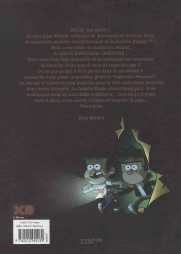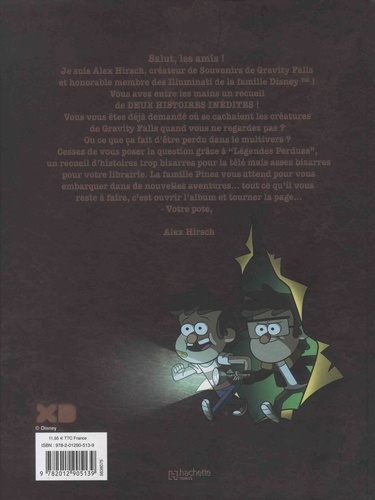 Salut, les amis ! Je suis Alex Hirsch, créateur de Souvenirs de Gravity Falls et honorable membre des Illuminati de la famille Disney ! Vous avez entre les mains un recueil de deux histoires inédites ! Vous vous êtres déjà demandé où se cachaient les créatures de Gravity Falls quand vous ne regardez pas ? Ou ce que ça fait d'être perdu dans le multivers ? Cessez de vous poser la question grâce à "Légendes perdues", un recueil d'histoires trop bizarres pour la télé mais assez bizarres pour votre librairie. La famille Pines vous attend pour vous embarquer dans de nouvelles aventures... Tout ce qu'il vous reste à faire, c'est ouvrir l'album et tourner la page... Votre pote, Alex Hirsch