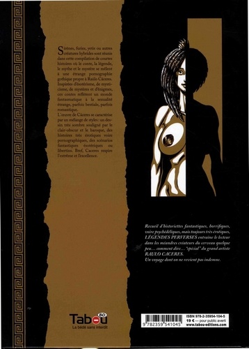 Sirènes, furies, yetis ou autres créatures hybrides sont réunis dans cette compilation de courtes histoires où le conte, la légende, le mythe et le mystère se mêlent à une étrange pornographie gothique propre à Raúlo Cáceres. Inspirées d'ésotérisme, de mysticisme, de mystères et d'énigmes, ces contes reflètent un monde fantasmatique à la sexualité étrange, parfois bestiale, parfois romantique. L'oeuvre de Cáceres se caractérise par un mélange de styles : un dessin très sombre souligné par le clair-obscur et le baroque, des histoires très érotiques voire pornographiques, des scénarios fantastiques ésotériques ou libertins. Bref, Cáceres respire l'extrême et l'excellence.