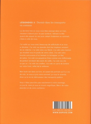 Emmanuel Guibert, auteur du Photographe et de La Guerre d'Alan, a profité de ses voyages en transport en commun pour dessiner ses voisins endormis... Il a ainsi composé d'étonnants portraits de quidams, où le lâcher-prise est total et les convenances sociales oubliées, ce qui lui permet de mettre en scène une humanité parfaitement inattendue. Touché par cette petite mort qu'est le sommeil, Guibert assortit ses remarquables dessins de textes où se mêlent anecdotes personnelles et considérations philosophiques, au service d'une réflexion sur les relations que nous entretenons avec la mort. A la fois profond et léger, philosophique et esthétique : un magnifique " Aire Libre ", deuxième volume de Légendes, après un premier tome où Guibert, dessinant cette fois dans de prestigieux musées, en avait offert une ludique et splendide vision.