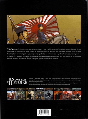 Meiji, qui signifie littéralement "gouvernement éclairé", est à la fois le nom de l'ère qui voit le Japon basculer dans la modernité et de celui qui l'a incarnée. A partir de 1868, une période de réformes radicales va se cristalliser autour du jeune Mutsuhito, l'empereur Meiji, porté au pouvoir par un coup d'Etat et qui doit mener son pays dans l'aventure d'un changement de civilisation. En à peine une génération, les dirigeants réformateurs qui gouvernent en son nom vont bouleverser en profondeur la société japonaise, et hisser cet archipel au rang des grandes puissances de la planète.