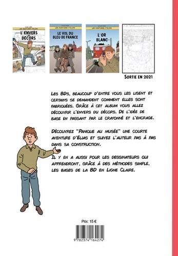 Les BDs, beaucoup d'entre vous les lisent et certains se demandent comment elles sont fabriquées. Grâce à cet album, vous allez découvrir l'envers du décor. De l'idée de base en passant par le cartonné et l'encrage. Découvrez "Panique au Musée" une courte aventure d'Elias et suivez l'auteur pas à pas dans sa construction. Il y en a aussi pour les dessinateurs qui apprendront grâce à des méthodes simples les bases de la BD en ligne claire.