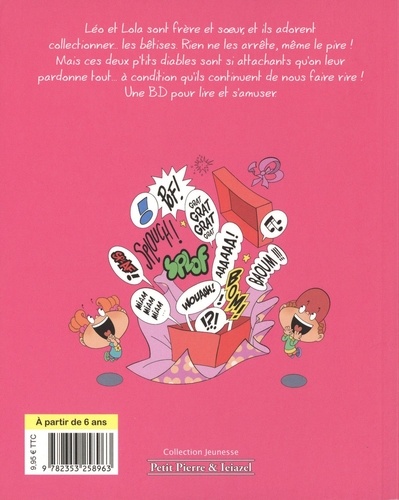 Léo et Lola sont frère et soeur, et ils adorent collectionner... les bêtises. Rien ne les arrête, même le pire ! Mais ces deux p'tits diables sont si attachants qu'on leur pardonne tout... à condition qu'ils continuent de nous faire rire ! Une BD pour lire et s'amuser.