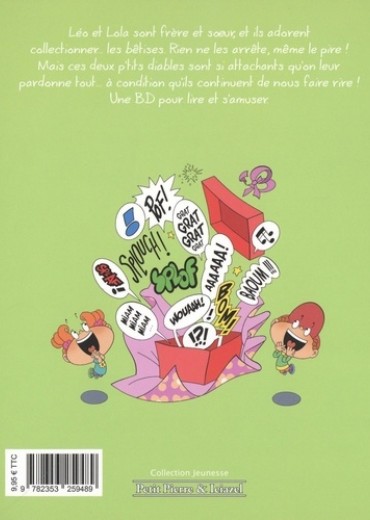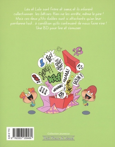 Léo et Lola sont frère et soeur, et ils adorent collectionner... les bêtises. Rien ne les arrête, même le pire ! Mais ces deux p'tits diables sont si attachants qu'on leur pardonne tout... à condition qu'ils continuent de nous faire rire ! Une BD pour lire et s'amuser.