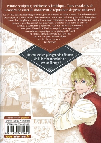 Ne en 1452 dans le petit village de Vinci, près de Florence en Italie, le jeune Léonard montre très tôt un esprit vif et observateur. Libre et novateur, c'est un touche-à-tout qui se perfectionne dans toutes les disciplines possibles. Il développe notamment de nouvelles techniques de peinture qui influenceront des générations d'artistes. Mais outre les arts, les sciences le passionnent également Tous ses manuscrits montrent à quel point Léonard de Vinci est un précurseur, que ce soit en anatomie, en physique ou en géologie. Il s'éteint en France, laissant derrière lui l'une des. oeuvres les plus emblématiques de la Renaissance : La Joconde.